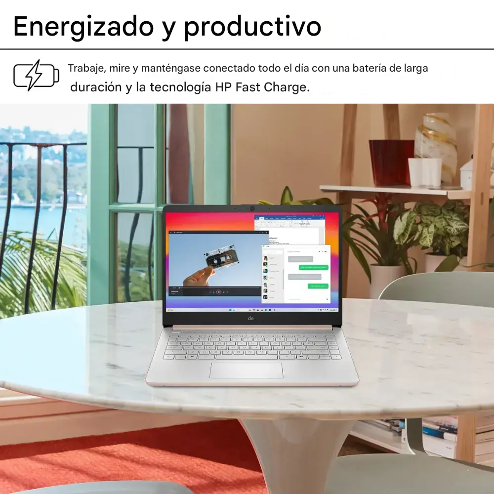 La HP 14-DQ6015DX es una laptop compacta y ligera de 14 pulgadas, ideal para tareas básicas como navegación web, ofimática y reproducción multimedia. Cuenta con 4GB de RAM y 128GB de almacenamiento UFS, ofreciendo un rendimiento adecuado para el uso diario. Viene con Windows 11 Home preinstalado y un diseño en color rosado, con teclado en inglés. Su portabilidad y eficiencia energética la hacen ideal para estudiantes o usuarios que buscan una computadora sencilla para actividades cotidianas.