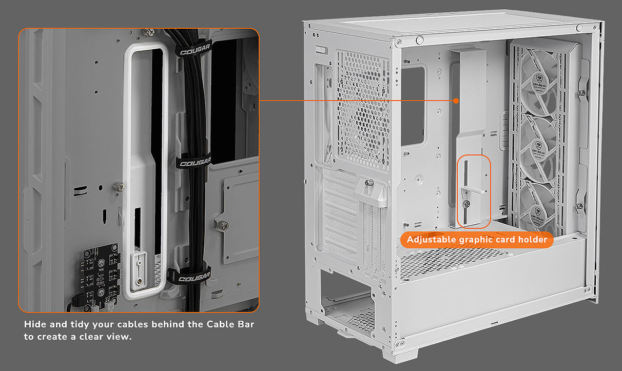La barra de administración de cables está ingeniosamente diseñada para funcionar también como un soporte para tarjetas gráficas, haciendo el uso más eficiente del espacio disponible. Este diseño innovador no solo le brinda una visión clara de sus componentes, sino que también mejora la estabilidad del rendimiento.