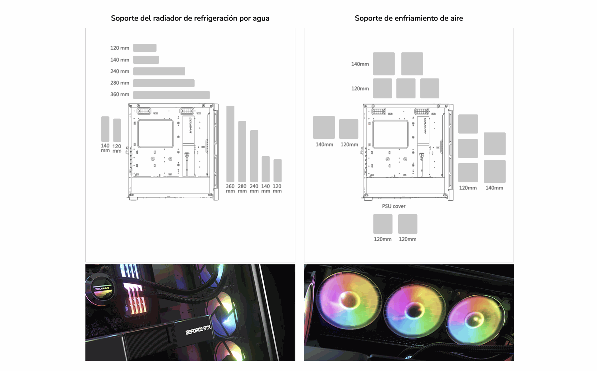 - Soporta ventilador 120 mm x 3 / 140 mm x 2 (Parte frontal)