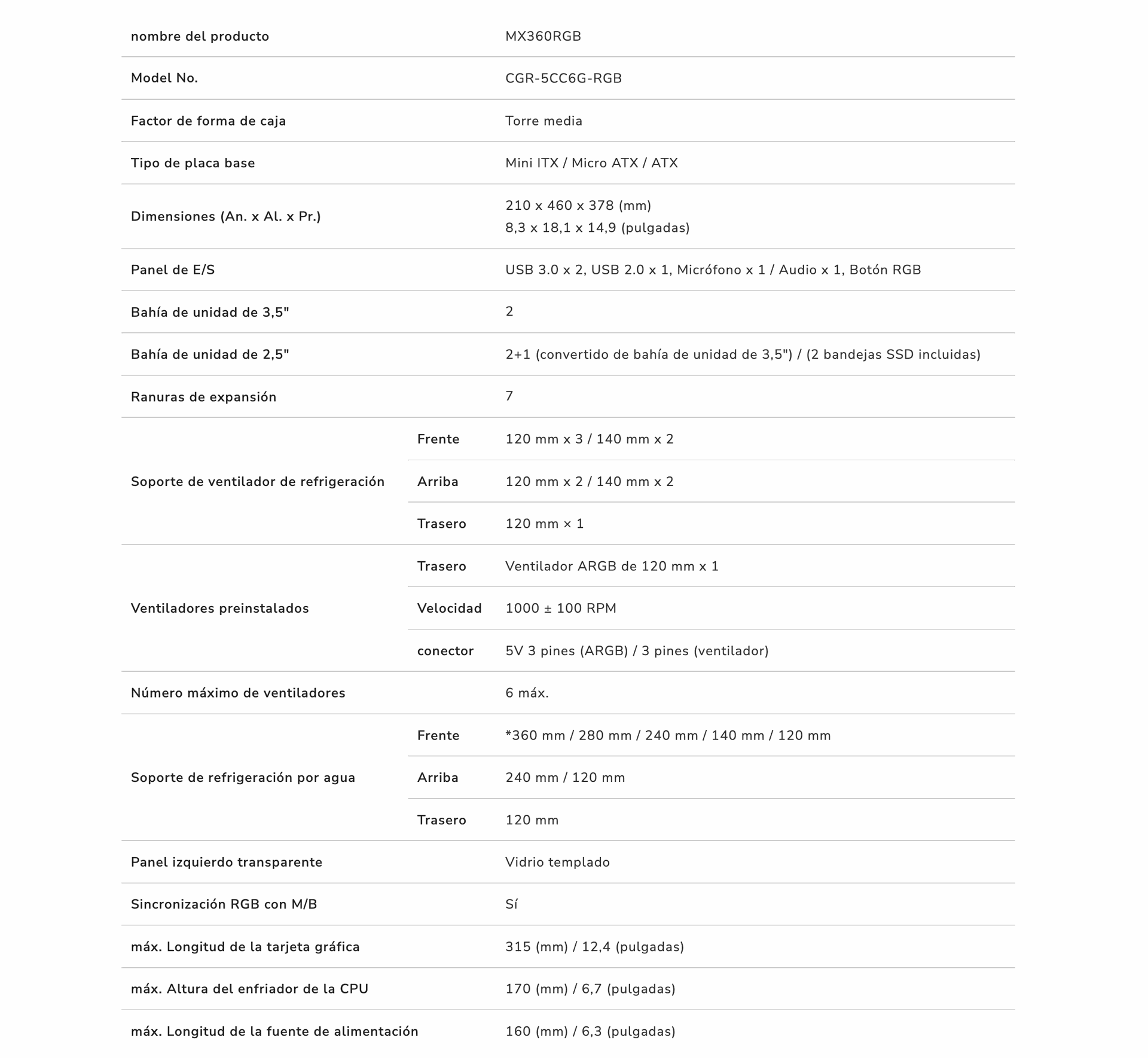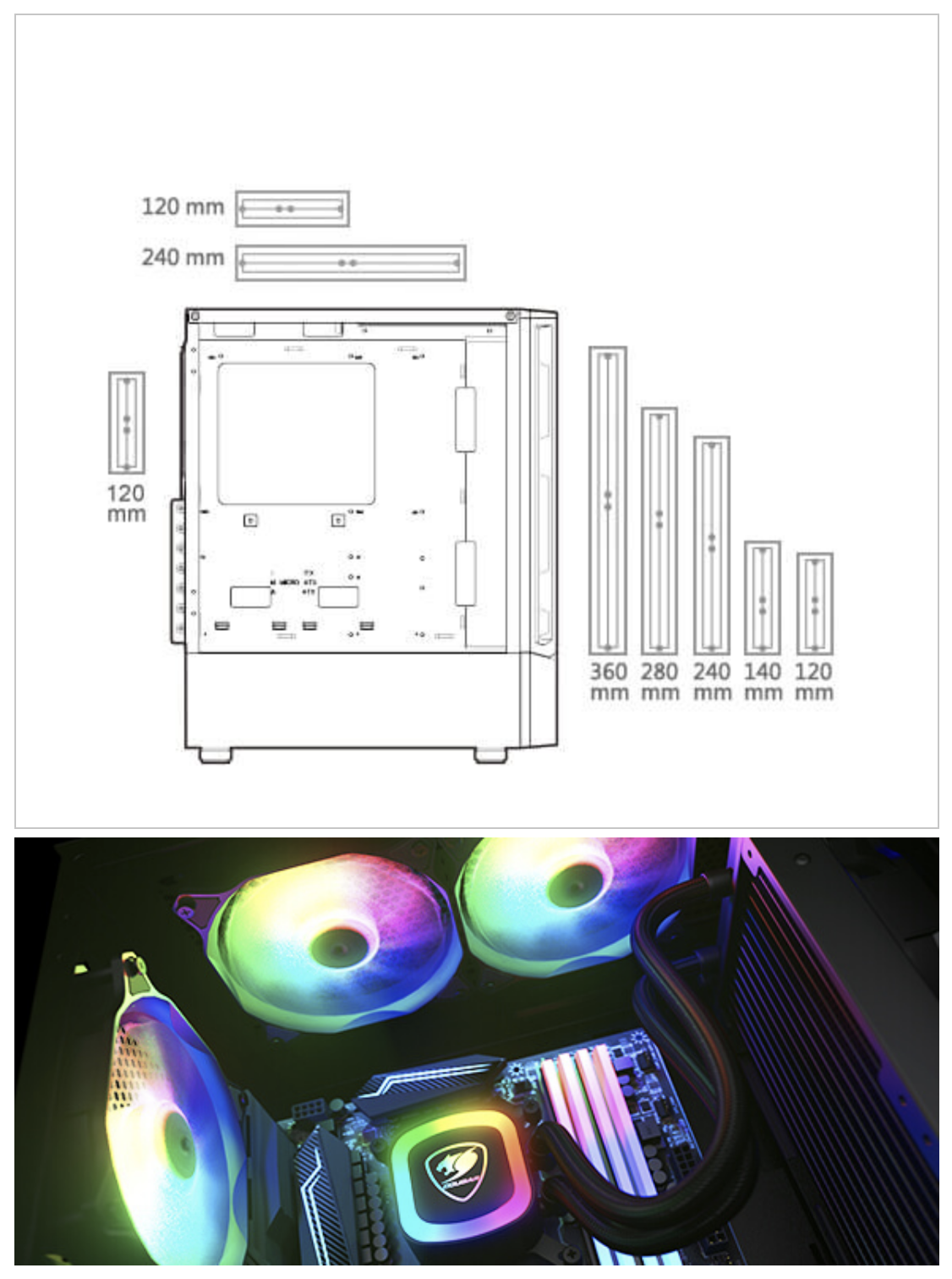El diseño compacto de MX360 RGB le permite instalar seis ventiladores, un radiador de refrigeración por agua de 360 ​​mm y un enfriador de CPU de 170 mm. Este inmenso potencial de refrigeración le permitirá elegir libremente los componentes.