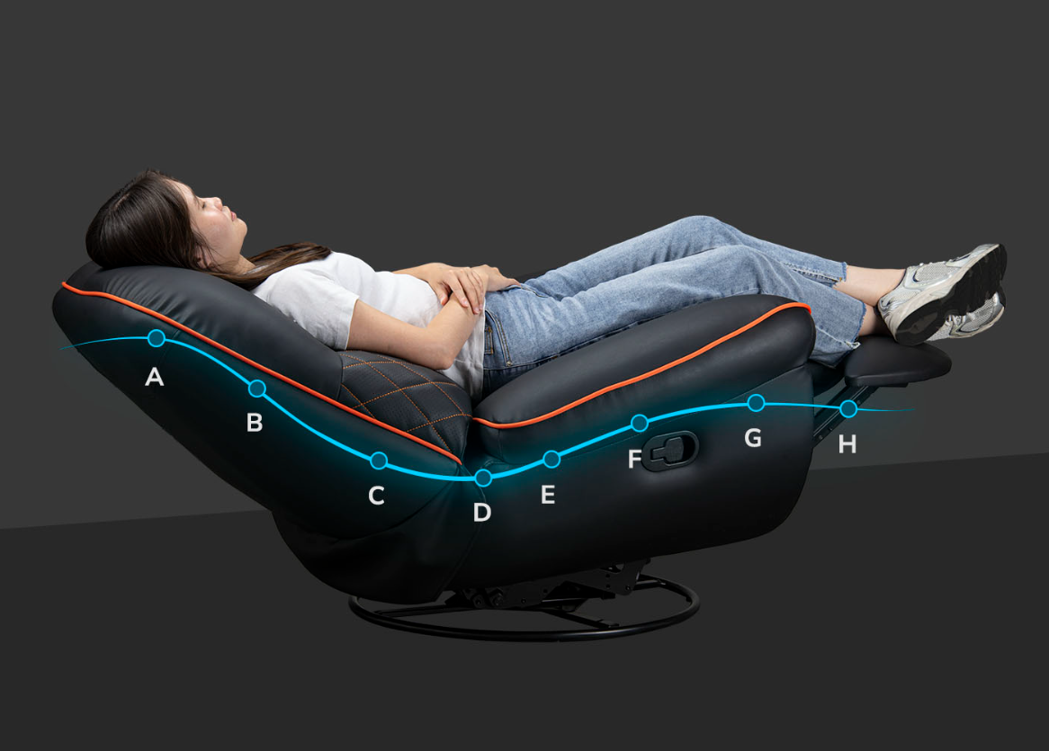 F. Muslos: El ángulo de reclinación ajustable mejora la comodidad de las piernas y promueve la circulación.