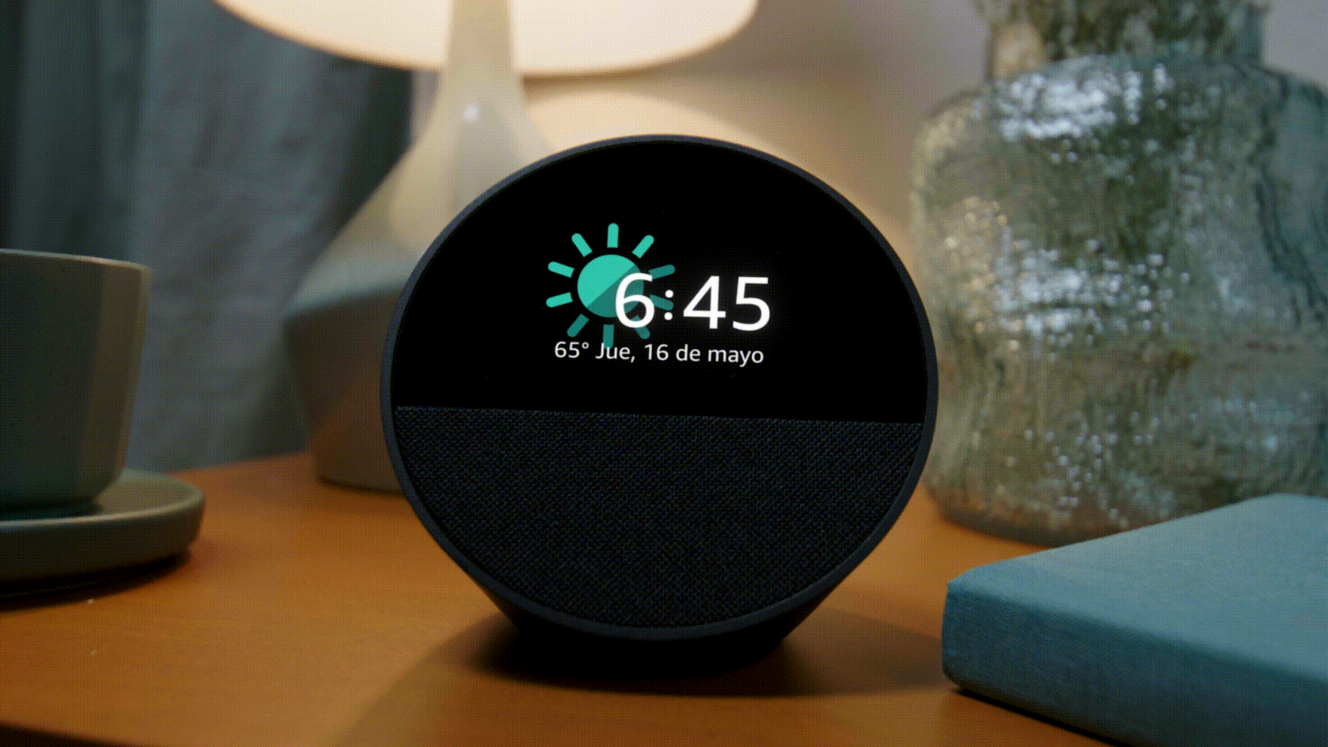 Ve los timers y recordatorios de un vistazo, o bien presiona ligeramente el Echo Spot para posponer la alarma. También puedes establecer tonos de alarmas exclusivos del Echo Spot.