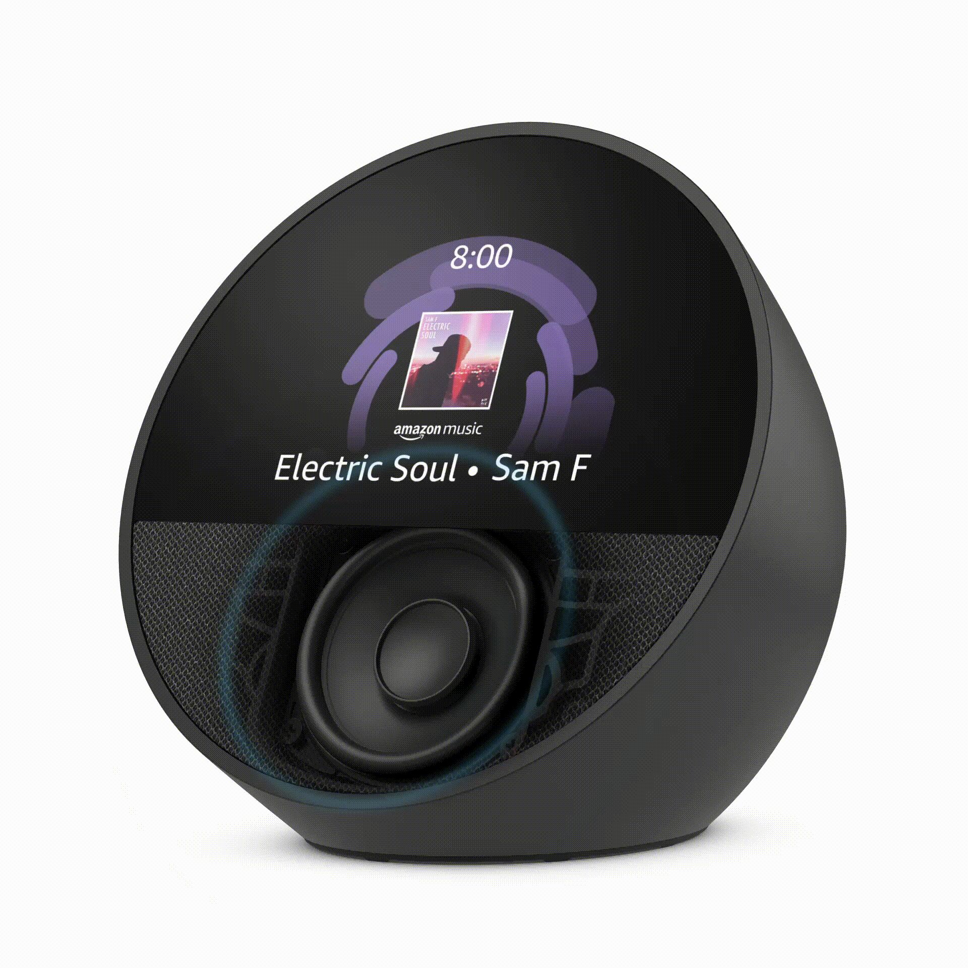 Llena tu dormitorio con música o conecta un Echo Spot (modelo de 2024) adicional para crear un sonido estéreo y disfrutar de un mejor sonido.