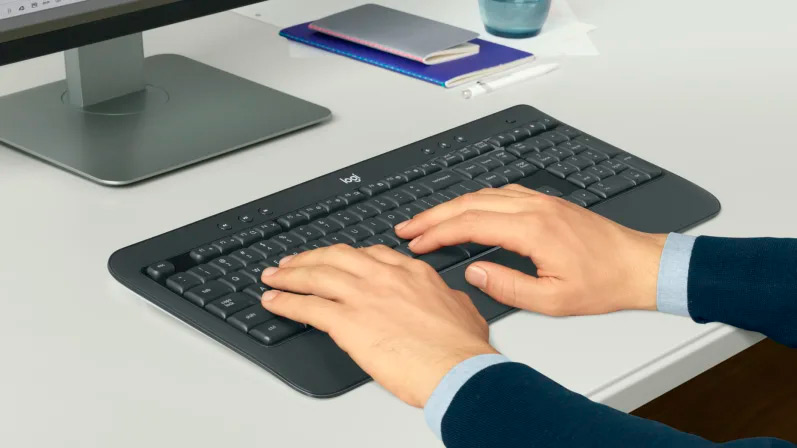 Las teclas se optimizaron para mejorar la precisión y reducir el ruido. Tus dedos encontrarán fácilmente su sitio gracias a la distribución y superficie de teclas habituales. El reposamanos y las patas extensibles con inclinación ajustable contribuyen al confort durante periodos de uso prolongado.