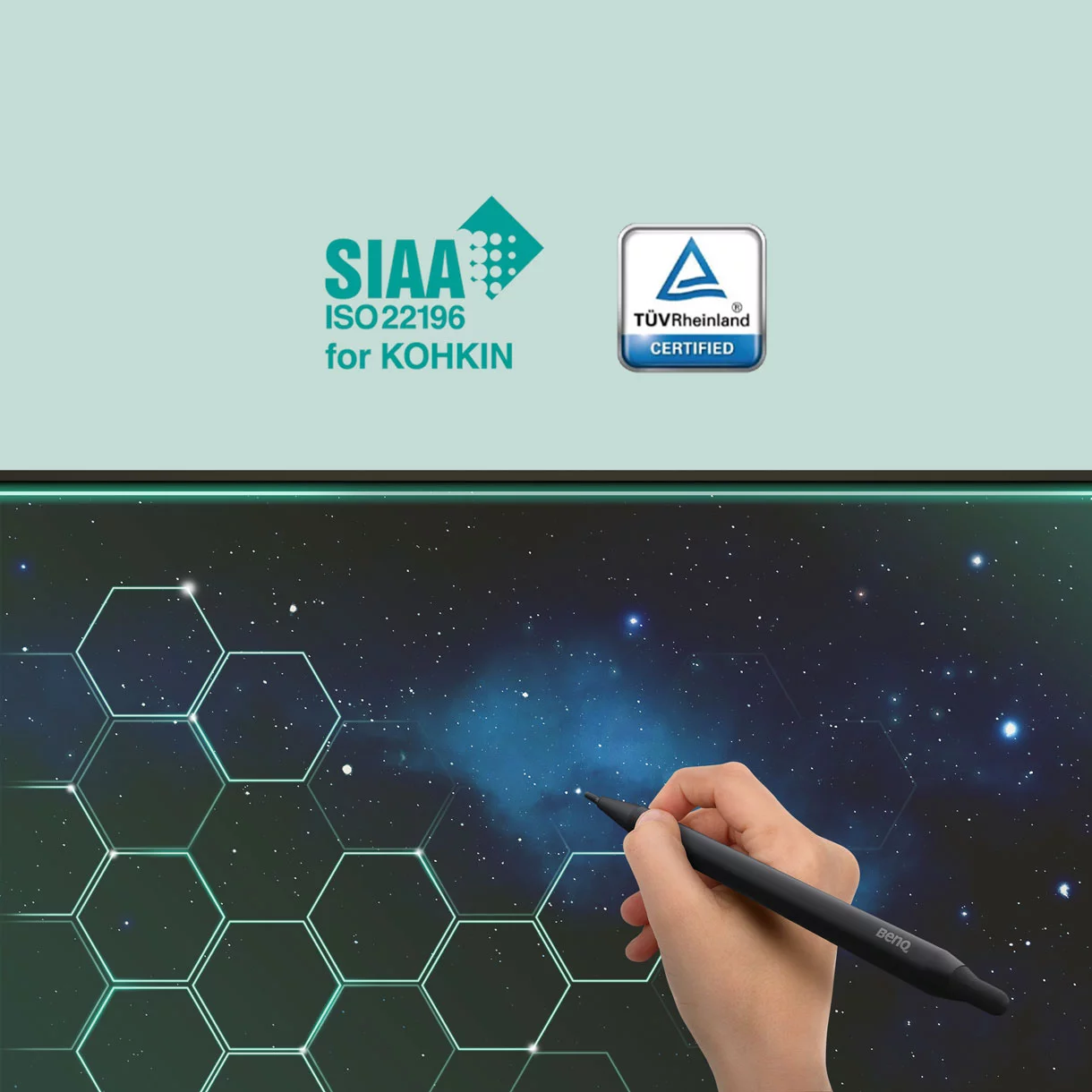 La serie RE reduce la transmisión de gérmenes en el aula. Su pantalla táctil, la pluma y el botón del panel frontal vienen con nuestra fórmula resistente a gérmenes, reconocida por TÜV con una eficacia del 99,9% contra los gérmenes comunes.
