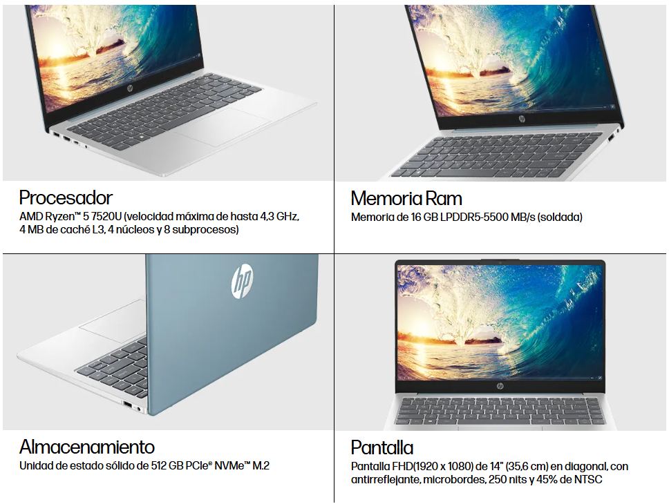 Laptop HP 14-em0021la 14" AMD Ryzen 5 7520U 16GB RAM 512GB SSD W11 Home Celeste Teclado Español