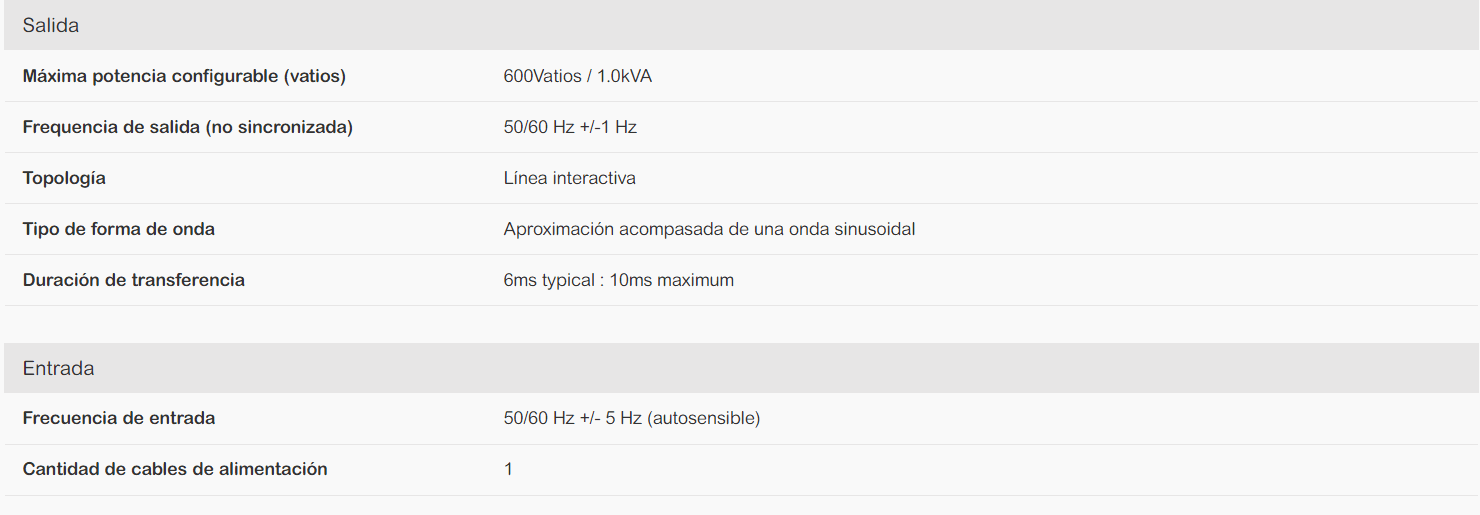 - Potencia de salida 600 Vatios / 1.0 kVA