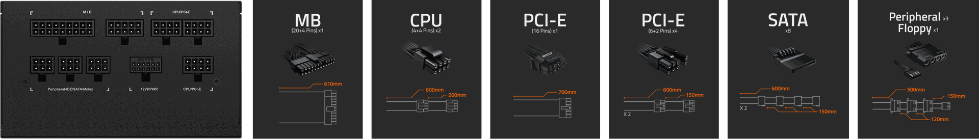 - PCIe 6+2 pines x 4: 600 mm+150 mm*2