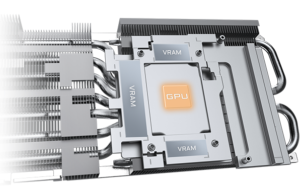 La gran cámara de vapor entra en contacto directo con la GPU, junto con los tubos de calor de cobre compuestos, que transfieren rápidamente el calor de la GPU y la VRAM al disipador de calor.