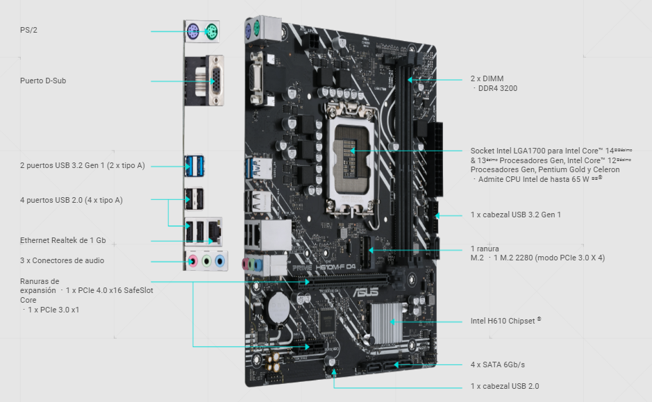 Motherboard ASUS PRIME H610M-F D4 Socket LGA1700 14th, 13th y 12th Gen 2xDDR4 micro ATX