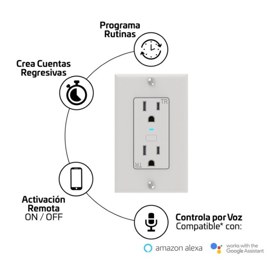El Tomacorriente está equipado con dos salidas con polo a tierra que puedes controlar simultáneamente a través de la aplicación VTA+ en tu dispositivo móvil. Esto significa que puedes encender o apagar tus dispositivos conectados con un simple toque en tu pantalla, sin importar dónde te encuentres.