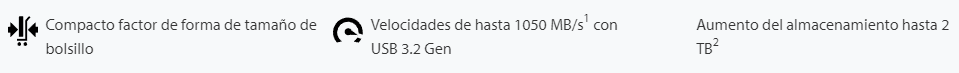 Alcance velocidades de lectura/escritura de hasta 1.050 MB/s1, con retrocompatibilidad con USB 3.2 Gen 1, lo cual posibilita una perfecta compatibilidad con dispositivos más antiguos.